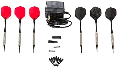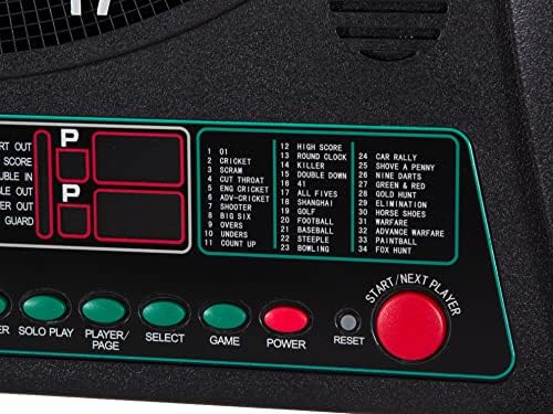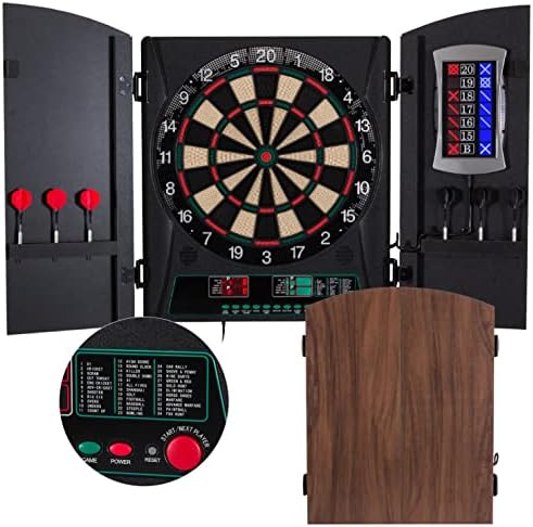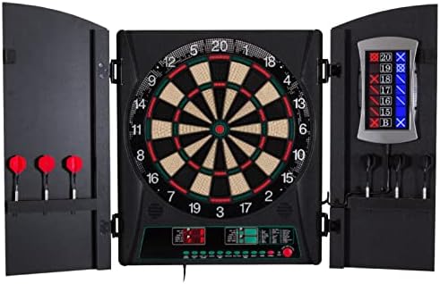The Arachnid Cricket Maxx 1.0 Electronic Dartboard Cabinet Set features a 13.5″ target area, 34 games, and 183 level variations (4 cricket games) for up to eight players. The large door mounted backlit X/O cricket display is in the popular pub style format. Solo play allows for practice and optional heckler feature that mocks bad darts and applauds good scores adds a level of fun. The Cricket Maxx Cabinet Set includes built-in dart holders and two sets of soft-tip darts. The integrated wood door cabinet doors make it a perfect fit for the game room. The ARACHNID trademark is a registered trademark owned by Arachnid 360 LLC and used by Escalade Sports pursuant to license.